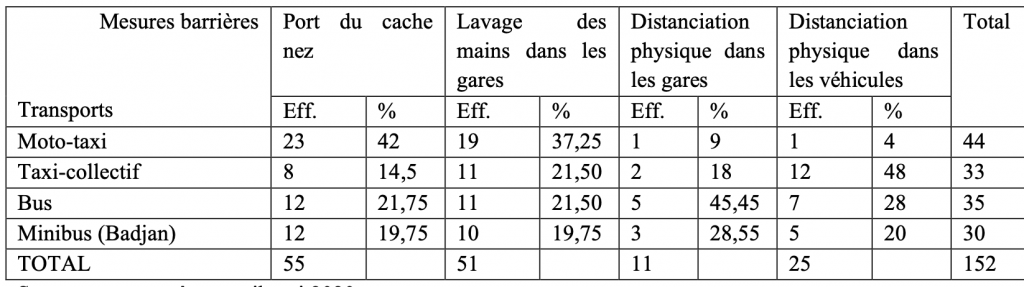 « distanciation physique dans les véhicules de transport », les réponses des opérateurs nous font comprendre qu’elle est respectée à 48 % dans les taxis-collectifs contre 28 % dans les bus et 20 % dans les minibus. Sur les motos-taxis, un seul opérateur a affirmé la mettre en pratique. Ce sont en moyenne 24,25 % des opérateurs qui font respecter cette mesure dans les véhicules de transport public. En tenant compte des réponses des opérateurs, les mesures barrières sont peu appliquées.