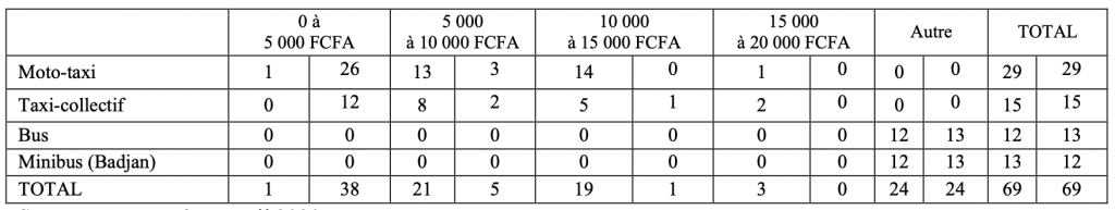 Sur les 29 opérateurs de moto-taxi interrogés, 26 personnes affirment que les propriétaires de leur véhicule ont maintenu la recette à au plus 5 000 FCFA/jour. Dans le 2nd intervalle, ils sont 03 opérateurs à dire que la recette a été maintenue entre 5 000 FCFA/jour et 10 000 FCFA/jour pendant le confinement contre 13 individus avant la COVID-19. Dans le 3ème intervalle de recette, il y a 14 opérateurs qui disent verser entre 10 000 FCFA/jour et 15 000 FCFA/jour avant la pandémie. Dans le 4ème intervalle, le nombre tombe à un (01). A l’analyse, la recette exigée aux opérateurs de moto-taxi n’a pas enregistré une variation importante sauf pour ceux à qui il est demandé de verser au plus 5 000 FCFCFA/jour. Cela induit donc une forte baisse de l’activité pendant la période du confinement. Concernant les opérateurs de taxi-collectif, d’un effectif de zéro à verser une recette inscrite dans le 1er intervalle (0 à 5 000 FCFA/jour), ce nombre passe à 12 pendant le confinement. Dans le 2nd intervalle de recette, il y a 08 opérateurs avant la COVID-19 contre 02 pendant le confinement. Dans le 3ème intervalle, il y a, dans le même ordre, 05 opérateurs contre 01. Il y a seulement 02 opérateurs qui affirment remettre au propriétaire une recette comprise entre 15 000 FCFA/jour et 20 000 FCFA/jour avant la pandémie contre zéro dans la période de confinement. Chez les opérateurs de taxi-collectif, la recette de 0 et 5 000 FCFA/jour exigée pendant le confinement matérialise la chute des sollicitations de ce véhicule dans les dessertes locales. S’agissant des compagnies de bus et de minibus, le montant de recettes versé avant la COVID-19 et pendant le confinement n’a pas enregistré une variation significative.