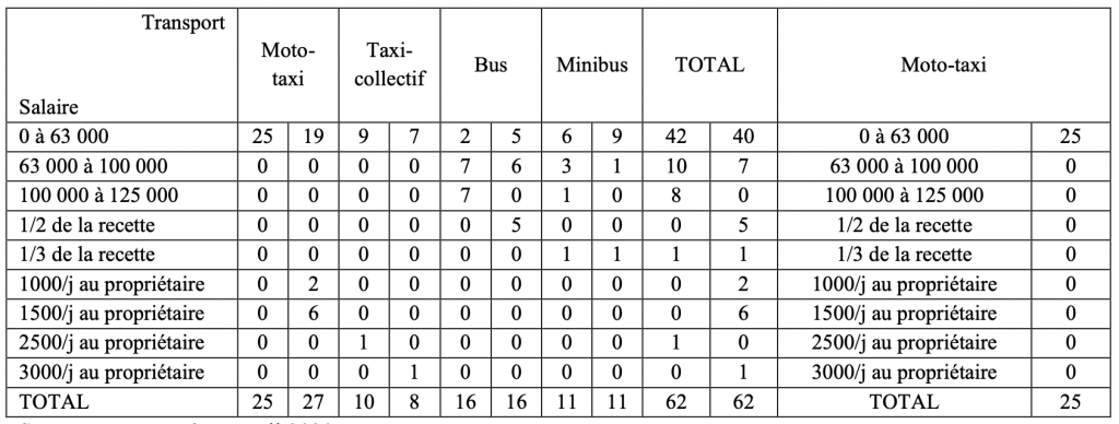 opérateurs de bus et de minibus. A ce niveau, les salaires ont peu varié. Selon le tableau 8, ci- dessus, les bases d’indexation du salaire sont : le partage de la recette avec le propriétaire (1/2 et 1/3 de la recette) et le versement de la somme de 1000 FCFA, 2000 FCFA, 2500 FCFA ou 3000 FCFA/jour au propriétaire. En tenant compte de cette donne, 05 opérateurs de bus affirment verser au propriétaire la moitié de la recette et garder le reste comme salaire. Un opérateur de minibus qui dit le faire mais à 1/3 avant la crise mentionne également que le propriétaire a maintenu ce mode pendant le confinement. Concernant ceux qui versent des montants forfaitaires de recettes au propriétaire et gardent le reste comme rémunération, il y a 02 opérateurs de moto-taxi qui disent donner 1 000 FCFA/jour au propriétaire et 06 opérateurs de ce même véhicule pour qui c’est 1500 FCFA/jour.