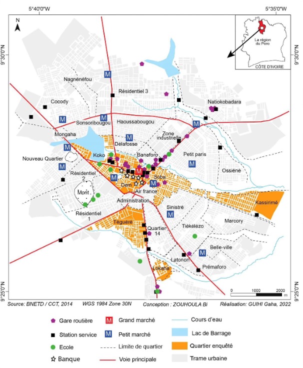 Le cadre d’étude est Korhogo. Située dans le nord de la côte d’Ivoire, elle est la capitale de la région des Savanes. Sur une superficie urbaine de 2984,76 hectares, elle compte 34 quartiers (voir carte ci-dessous). M. R. Zouhoula Bi (2014 : pp. 172-173) les « subdivise en trois grandes zones ». Représentant 11,14 % de la superficie urbanisée pour 21,86 % de la population, la première zone se composent de deux centres anciens (Kôkô et Soba) et d’un centre administratif (Dem) où sont localisé la majorité des services urbains. Il y a ensuite la deuxième zone qui est le péricentre. Faisant 68,95 % de la superficie pour 63,70 % de la population, c’est la zone la plus dense avec un tissu industriel et qui concentre l’essentiel de la demande de transport de la localité. La troisième zone est la périphérie avec 19,91 % de la superficie et 14,44 % de la population. En consolidation suite à la fin du conflit inter-ivoirien, les populations de cette partie renforcent la demande du péricentre en déplacements sociaux et professionnels.