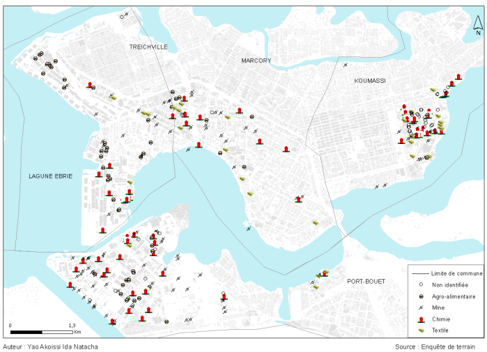 La base d’analyse de cette étude tire son fondement de la théorie de localisation (Walter Christaller, 1933) qui tente d’expliquer la distribution des activités industrielles dans l’espace géographique à travers la théorie des lieux centraux. La théorie des lieux centraux permet de mieux cerner le dispositif urbain. La collecte de données s’est faite en deux phases : la recherche documentaire et l’enquête de terrain. La recherche documentaire a été faite à l’IRD (Institut de Recherche pour le Développement), au CIAPOL (Centre Ivoirien Anti-pollution), à l’IGT (Institut de Géographie Tropicale), à l’INS (Institut National de la Statistique), à la chambre de commerce et d’industrie et au BNETD (Bureau National d’Etudes Techniques et de Développement). Elle a permis d’avoir des statistiques sur les industries, l’historique des planifications urbaines et des zones industrielles. Les fonds de cartes proviennent du Comité National de Télédétection et d’Information Géographique (CNTIG). Concernant l’enquête de terrain, une géolocalisation des industries et des zones vulnérables avec un GPS (Global Positioning System) a été nécessaire au cours de l’observation.