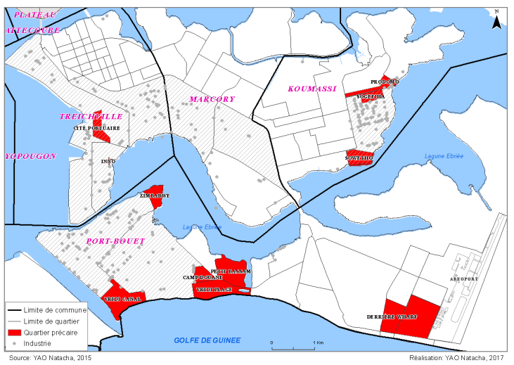 Tous les schémas n’ont pas été suivis car ils se sont révélés très vite caducs suite à une urbanisation très rapide. Aujourd’hui, industries et habitats se partagent les espaces. Car plusieurs quartiers précaires se sont développés dans les zones industrielles de Treichville, de Koumassi et de Port-Bouët. Il s’agit du quartier Innoh dans la zone industrielle de Treichville, des quartiers Soweto et de Yapokro dans le secteur de Prodomo (Koumassi) ainsi que des quartiers de Vridi village, petit Bassam, de Vridi Canal et de Zimbabwe à Port-Bouët sous le regard des ministères de l’industrie, de la construction et de l’environnement (figure 7). Ce qui montre un problème réel de gestion quotidienne d’infrastructures industrielles.