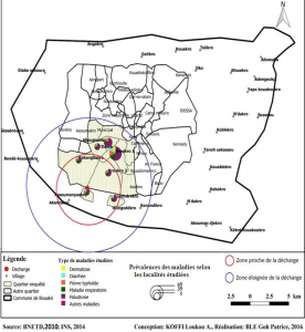 L’utilisation d’un indicateur de morbidité pour l’appréciation de l’impact sanitaire de la proximité des habitats aux lieux de stockage des déchets s’apparente à la méthode de travail de K. Kouassi (2013, p.399). Sur la base d’une analyse spatiale de l’incidence des maladies diarrhéiques infanto-juvéniles dans la commune d’Adjamé à Abidjan (Côte d’Ivoire), cet auteur a montré que la proximité spatiale des habitations aux lieux de stockage des déchets constitue un risque sanitaire pour les populations. Il ressort donc que les maladies environnementales affectent plus les populations des localités situées dans le périmètre de 3 kilomètres autour de cette décharge que ceux des autres localités.