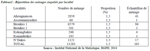 Pour obtenir le nombre de ménages par quartier, nous avons procédé comme suit : Nombre de ménages à enquêter par quartier = Proportion de ménage (N*) × Nombre de ménage total par quartier. Exemple : Assoumanyaokro : Nombre de ménage à enquêter= 60 × 0,015=1. Le tableau 1 présente la répartition de l’échantillonnage.