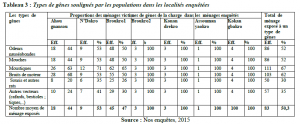 Le tableau 3 met en exergue les différents types de gênes relevés par les ménages enquêtés. En effet ces ménages ont révélé à une proportion de 50,30% que la décharge d’Assoumanyaokro engendre des gênes qui rendent insupportable leur condition de vie. Les ménages des quartiers d’Ahougnansou, N’Dakro, Broukro1 ont répondu respectivement à 44%, 53% et 47% que les différents types de gênes mentionnées dans le tableau 3 affectent négativement leur cadre de vie. En plus de ces résultats ce tableau 3 présente les avis des ménages enquêtés qui habitent des localités de Broukro 2, Konandrekro, Assoumanyaokro, Kokangbakro qui sont situées dans un rayon de 0 à 3 kilomètres (tableau 2). Les ménages de ces localités ont tous répondus à 100% que ces types de gênes rendent difficiles la vie des riverains.
