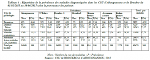 et la vitesse de propagation des maladies, nous avons utilisé la prévalence qui est l’un des meilleurs indicateurs de morbidité permettant la compréhension de l’évolution d’une maladie au sein d’une population donnée (J. Feingo, 1998, p. 402). À ce titre, une cohorte rétrospective a été réalisée avec le support des registres de consultation des CSU de Broukro et d’Ahougnansou. Les informations recueillies ont permis de calculer la prévalence selon la formule suivante : ×k (Avec P : Prévalence ; D : la population exposée aux risques sanitaires; N : les personnes qui ont manifesté des symptômes des pathologies étudiées au cours de cette année 2015 ; K : unité de taille).