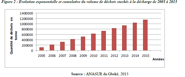 En dehors des facteurs naturels, des facteurs humains sont aussi responsable de la détérioration des conditions de vie à la décharge d’Assoumanyaokro et ses environs. Entre autres facteurs anthropiques, l’urbanisation de la ville de Bouaké est à prendre en compte. L’urbanisation de la ville est traduite par une extension urbaine (d’une superficie de 85 hectares en 1940 (K. Atta, 1978, p. 80-93.) à 29 250 hectares aujourd’hui (INS, 2014)) et un volume de population sans cesse croissante (60 000 habitants en 1960 à 536189 habitants en 2014 (INS, 2014)). Une multiplication des activités économiques en rapport avec cette urbanisation entraîne la production d’énormes quantités de déchets. La production annuelle de ces déchets qui était de 766,5 tonnes en 1900 est passée à 12045 tonnes en 1960. En 1998 la commune de Bouaké a enregistré une production annuelle de 134792,5 tonnes de déchets solides urbains lorsque sa population a atteint 461618 habitants (Mairie-Bouaké, 2015). Selon l’ANASUR (2015), cette production a atteint 156566,75 tonnes/an de déchets pour 536189 habitants et que le volume de déchets évacués à la décharge chaque année est de 104076 tonnes. En raison de l’absence de tri et du caractère non biodégradable de certains déchets, il se crée un entassement des déchets de façon exponentielle à la décharge. Ainsi, le rythme de stockage des déchets a atteint 104076 tonnes/an. En outre de 104076 tonnes en 2005 et 208152 en 2006, le stock de déchets évacués dans cette décharge est de 1144836 tonnes en 2015 (L. A. Koffi, 2016, p. 73) (Figure 2). Cela a pour conséquences l’accélération des phénomènes environnementaux et l’accentuation des risques sanitaires sur la vie des populations riveraines.