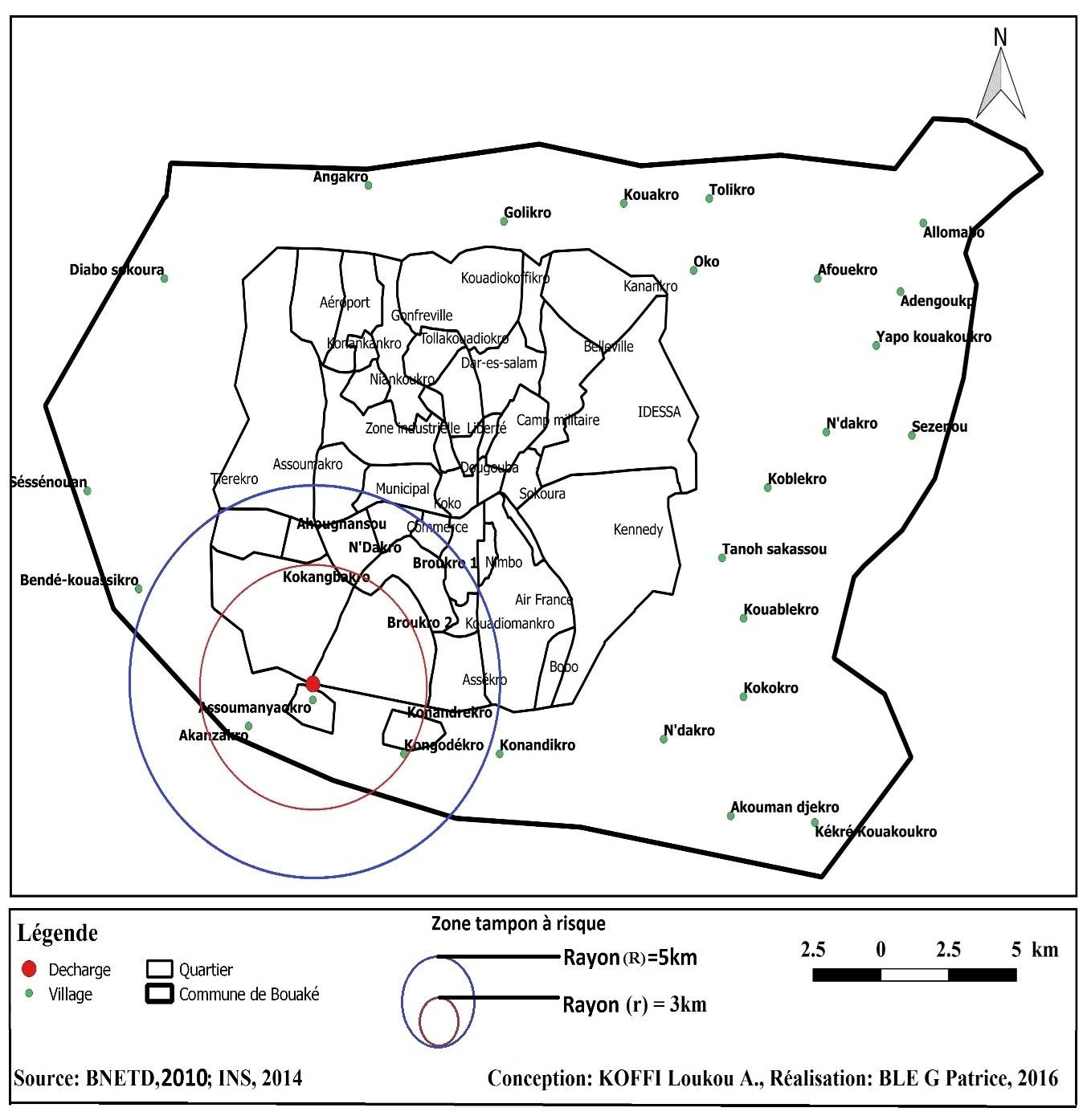 L’étude a aussi mis en relief une zone tampon d’exposition aux nuisances et aux risques sanitaires du fait de la présence de la décharge d’Assoumanyaokro. La délimitation de ces deux sous-zones d’exposition est corroboré par les résultats des enquêtes publiques du Syndicat Bil Ta Garbi (2010, p. 4). Pour ce syndicat français, le périmètre de 0 à 3 kilomètres représente une zone de sécurité à l’intérieur de laquelle toute activité humaine est interdite conformément aux normes françaises relatives à l’installation d’une zone d’élimination des déchets ménagers et assimilés ou d’une décharge publique.