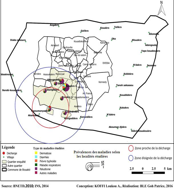 Dans la ville de Bouaké, ils subsistent des risques environnementaux avec des conséquences néfastes sur la santé des populations installées à la périphérie de la décharge publique d’Assoumanyaokro. Ce résultat confirme ceux de B. Koné (2014, p. 65) qui ont révélés que les cas des maladies environnementales (le paludisme, les maladies diarrhéiques, les maladies respiratoires) sont d’autant plus critiques à Broukro que dans les autres quartiers de Bouaké. Cela se confirme au regard de la répartition géographique des prévalences maladies étudiées. En effet, l’analyse des données des registres des soins curatifs des Centres de Santé Urbain d’Ahougnansou et de Broukro a montré une inégale distribution des maladies étudiées.