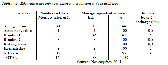 Le choix des ménages s’est fait par rapport à leur degré d’exposition aux nuisances sur la base d’une analyse spatiale de la portée des conséquences de la décharge sur les riverains. Cependant, il faut signaler qu’au-delà des ménages enquêtés certains ménages des quartiers et villages tels qu’Akanzakro, Kongodekro et Assèkro qui habitent à l’intérieur des zones tampons à risque de pollution subissent également de façon significative les impacts négatifs de la décharge d’Assoumanyaokro. Mais, le fait que ces quartiers n’ont pas fait l’objet de nos enquêtes est dû au fait que ceux-ci n’ont pas rempli les conditions pour le choix de l’échantillonnage d’enquête.
