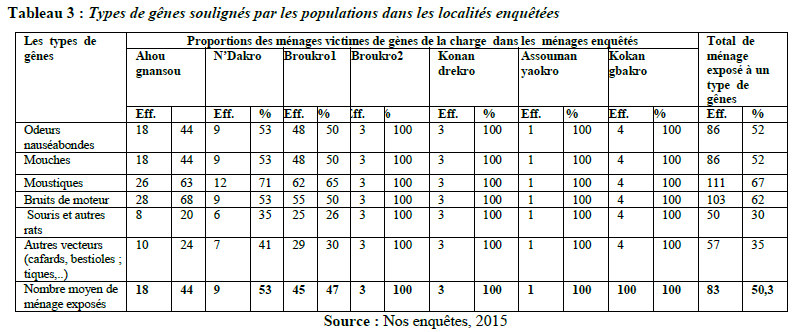 L’analyse du tableau 2 montre que sur les 165 chefs de ménages enquêtés, 50,30 % ont souligné les gênes de la décharge. On constate que les ménages des localités d’Assoumanyaokro, Broukro 2, Kokangbakro et Konandrekro qui ont tous affirmé être exposé aux nuisances de la décharge habitent dans un périmètre de moins de 3kilomètres de rayon par rapport à celle-ci. Contrairement à ces ménages, ceux des localités d’Ahougnansou, N’Dakro et Broukro1situées à des rayons compris entre 3 km et 5 km de cette décharge ont affirmé respectivement à 44%,47 % et 53 % d’être victimes des gènes lié aux problèmes environnementaux observés à la décharge et sur l’itinéraires des camions de collecte de déchets. À cet effet, M. KOUADIO Kouamé (chef du village d’Assoumanyaokro) a fait savoir qu’il reçoit au quotidien les plaintes des habitants des localités étudiées et des autres des villages éloignés de la décharge comme le village de Kongodekro. Compte tenu des difficultés de l’appréhension des unités de mesure de ces nuisances, nous nous sommes focalisés sur la détermination des ménages exposés à l’inhalation de la puanteur des déchets en putréfaction à la décharge et dans la cargaison de camion de collecte, à la prolifération des vecteurs de maladies (les mouches, les moustiques, les rats, les cafards…). Les renseignements obtenus auprès des ménages sur les types de gênes nous ont permis d’élaborer le tableau 3 ci-après.