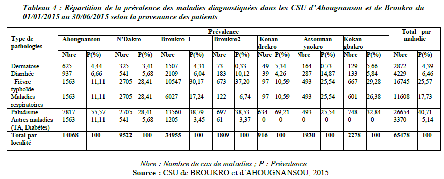 L’étude des impacts néfastes de la décharge sur les riverains nous a amené à faire une analyse du profil sanitaire des populations. Ainsi, nous nous sommes intéressés aux types de maladies qui affectent plus les riverains. Les ménages visités ont déclaré qu’ils souffraient de certaines pathologies comme le paludisme, les maladies diarrhéiques, les maladies respiratoires, la fièvre typhoïde et les dermatoses (tableau 4). Dès lors, nous avons parcouru les registres des centres de santé (CSU d’Ahougnansou et de Broukro) afin de parvenir à une analyse pertinente du profil sanitaire de la zone d’étude. À cet effet nous nous sommes intéressés aux patients qui proviennent des localités choisies pour l’étude. Les données collectées ont permis de calculer la prévalence des maladies étudiées et d’élaborer le tableau 4 ci-après.