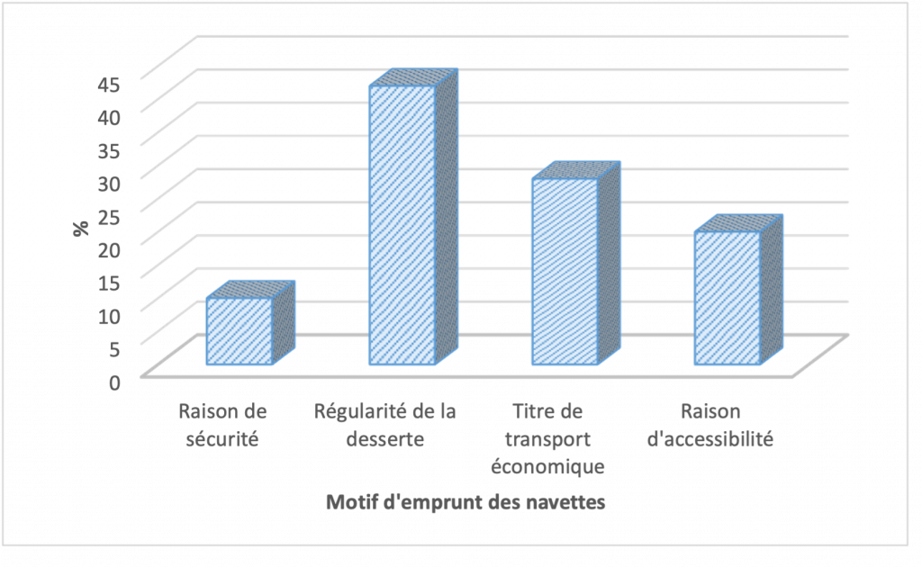 42 % des voyageurs enquêtés ont révélé que les bateaux-bus ou les pinasses sont réguliers et leur permettent d’arriver en temps réel à destination sans perdre assez de temps sur les routes contrairement au transport routier. 28 % ont estimé qu’ils empruntent les navettes à cause du coût du transport qui est à la portée de toutes les bourses. 20 % disent qu’ils voyagent sur la lagune Ebrié car les bateaux des compagnies régulières et les pinasses accèdent à des zones reculées non couvertes par d’autres moyens de transport. Les raisons de sécurité ont été révélées par 10 % des usagers. « les bateaux bus viennent toujours à l’heure et ils contournent les grandes voies car ils passent par la lagune, c’est rapide quand tu es pressé et on paye moins chère » affirme M.G.T.S