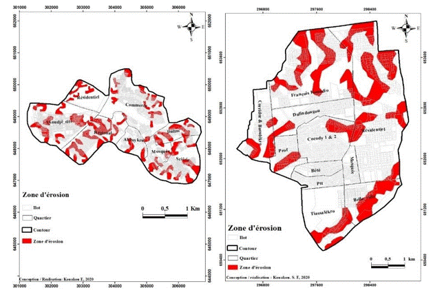 In Ivory Coast, the expansion of urban areas due to the increase in population density does not spare areas unsuitable for habitation. The towns of Tiassalé and N’douci are no exception to this reality. The objective of this study is to analyze the manifestations of flooding and erosion risks as well as their effects, both on the living environment and on the populations of the towns of Tiassalé and N’douci. This work required a methodology that combines documentary research, surveys and interviews. Sites at risk are determined by following an approach based on GIS, the final result of which is the establishment of flood and erosion maps. The surveys allowed photographs to be taken to highlight the action of flooding and erosion on the population and their living environment.