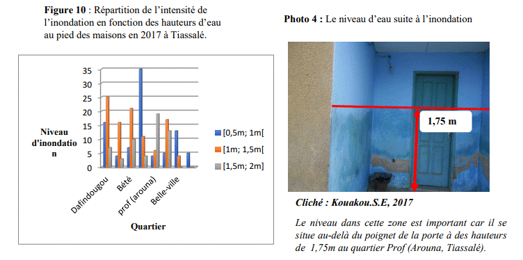 Tiassalé en volume d’eau. Du fait de l’abondance de l’eau, l’on a assisté au débordement de nombreuses rivières présentes dans la ville occasionnant des inondations dans des quartiers de Tiassalé. On enregistre à ce niveau entre 0,75 et 1 m le niveau de l’eau au pied des maisons (photo. 1). Dans les quartiers ne disposant pas d’ouvrages de canalisation des eaux de ruissellement, l’eau stagne sur une longue durée d’environ 4 à 5 jours.