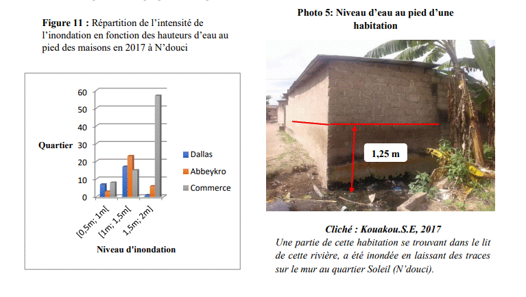 En analysant le niveau d’eau au pied des maisons, le plus important niveau d’eau observé à N’douci se situe au quartier Commerce avec 89,07% des bâtis inondés jusqu’aux niveaux comprises entre [1,5m ; 2m] (Photo. 5).