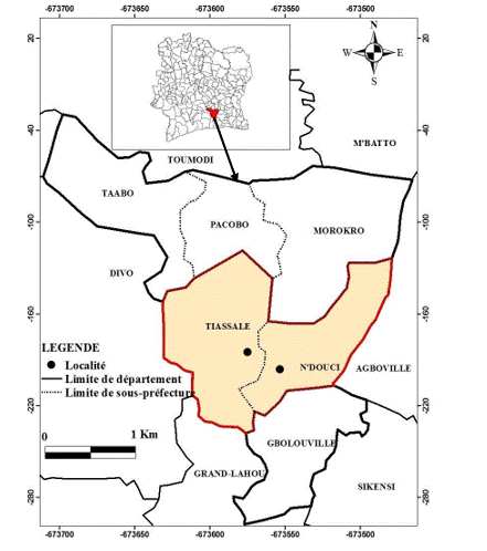 Les localités de Tiassalé et N’douci situées à la lisière du « V » baoulé, appartiennent à la région de l’Agnéby-Tiassa. Elles sont comprises entre 5°52ʼ00ʼʼ et 5°54ʼ00ʼʼ latitude Nord et 4°45ʼ00ʼʼ de longitude Ouest (Fig. 1). Ces villes sont situées au Nord de la capitale économique à une distance de 120 km, sont en concurrence avec les deux capitales du pays à savoir :