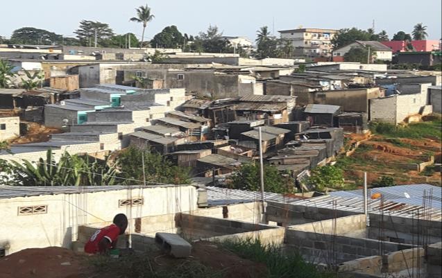 La ville d’Abidjan présente l’image d’une urbanisation qui entretient un déséquilibre social profond. Cela se perçoit à travers la lutte pour la conquête d’espace entre une urbanisation officielle, légale et une urbanisation officieuse, illégale, traduite par la prolifération de l’habitat précaire qui s’est imposé comme un mal nécessaire. Toutes les communes de la ville d’Abidjan sont touchées par le phénomène de bidonvilisation de leur espace. Le tissu urbain d’Abidjan se caractérise par l’apparition de nombreux quartiers précaires en périphérie contrastant avec le centre d’affaires le Plateau et ses tours « manhattaniennes ».