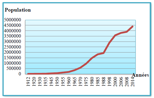 L’analyse de la figure permet de distinguer deux phases d’évolution caractérisées par les périodes 1912 à 1950 et 1950 à 2014. Au cours de la première période (1912-1950), on observe une croissance lente de la population. La période allant de 1950 à 2014 est marquée par une croissance quasi exponentielle de la démographie. Les variations de l’évolution démographique se justifient par les faits suivants : les grands travaux entrepris par l’administration coloniale afin de motiver son choix comme capitale de la colonie et la mise en place des symboles de l’administration coloniale après son érection en 1934 en chef-lieu de la colonie de Côte d’Ivoire constituent les éléments catalyseurs à la croissance de l’installation de la population européenne. En 1936, la population d’Abidjan, récemment érigé en capitale, atteint 17500 habitants. De 1950 à 1970, le taux de croissance de la population urbaine était de 10% par an, avant de diminuer progressivement à partir des années 1980 suite à la récession économique qui entraine les mouvements de populations vers les campagnes. Depuis l’indépendance, l’urbanisation d’Abidjan reste toujours rapide et alimentée par la croissance de sa population. La population au cours de la période 1960 à 1980 est passée de