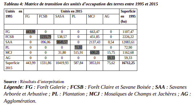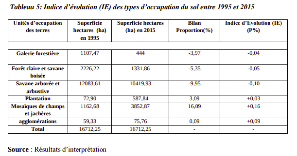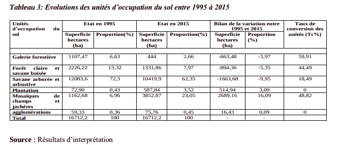 De l’analyse de ce tableau, on note des taux de conversion de certaines unités d’occupation des terres. Ainsi, a-t-on une évolution à la baisse de 59,91% pour la galerie forestière, de 44,49% pour les forêts claire et savane boisée, de 18,49% pour la savane arborée et arbustive et une augmentation de 48,42% pour les mosaïques de champs et jachères.