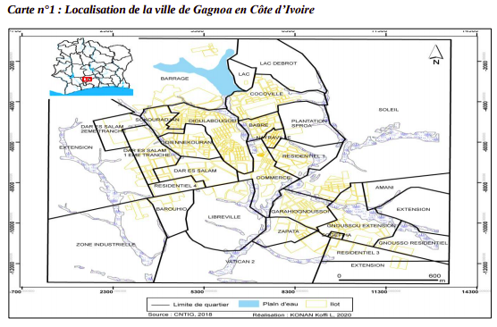 À Gagnoa, une ville située au centre-ouest de la Côte d’Ivoire (carte n°1), la culture du riz est une pratique très ancienne et bien ancrée dans l’écosystème urbain et périurbain grâce aux conditions climatiques, édaphiques et humaines qui lui sont favorables. D’abord pratiquée dans les années 1970-1980 sous la conduite de la Société de Développement de la Riziculture (SODERIZ) qui avait aménagé 36 hectares de bas-fonds de la ville (IES et MINAGRA, 1984, p. 17), la riziculture a ensuite été adoptée par les populations locales particulièrement les allochtones venus des autres régions de la Côte d’Ivoire et des pays voisins du nord (J-P. Dozon, 1974, p. 113). Bien que le riz soit l’aliment de base des populations de Gagnoa, il est pratiqué dans la ville pour la commercialisation, ce qui donc suscite un intérêt pour la pratique de l’agriculture urbaine dans la ville de Gagnoa en particulier la riziculture et sa contribution socioéconomique à la satisfaction des besoins des ménages agri-urbains.