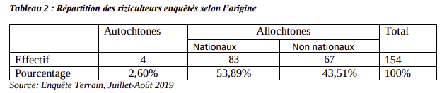 Les chiffres du tableau 2 montrent que les allochtones sont les plus nombreux producteurs de riz de la ville de Gagnoa. Ils sont repartis comme suite : les nationaux (53,89%) et les non nationaux (43,51%). Disons que ces allochtones viennent en générale des régions du nord du pays et sont composés en grande partie des Sénoufo et Malinké pour les nationaux. Les non nationaux viennent essentiellement des pays voisins tels que le Burkina-Faso (67,65% des non nationaux), le Mali (20,59% des non nationaux) et la Guinée (11,76% des non nationaux). Il ressort aussi de ces résultats que parmi ces deux catégories de producteurs se trouvent d’une part des natifs (56%) et d’autre part, des anciens migrants installés depuis plus de 20 ans (41,66%) et 30 ans (30,55%) à Gagnoa. En revanche à Abidjan, les études ont montré que les non nationaux dominent à plus de 60% la population agricole urbaine (A. Olahan, 2010, p. 7; A. M. Koffi-Didia, 2015, p. 15).