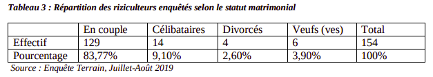 Il faut par ailleurs noter la faible présence des autochtones bété dans la production du riz qui est pourtant reconnu comme leur aliment de base. Comment les bas-fonds de la ville et la production du riz a pu échapper aux Bété de Gagnoa? En réalité, les Bété ne pratiquent pas beaucoup les cultures de bas-fond. Pour eux les travaux liés aux bas-fonds sont beaucoup plus difficiles; une présence régulière dans le bas-fond pourrait impacter négativement la virilité de l’homme et en outre, les anciens ont fait savoir aux autres générations que le bas-fond constituait un lieu de refuge pour les génies. Ce qui pourrait expliquer cette dynamique de la population allochtone dans la riziculture à Gagnoa qui est liée essentiellement au fait que les bas-fonds sont aux mains des allochtones (J-P. Dozon, 1975, p. 1331). Selon cet auteur, une fraction importante des volontaires en 1973 sont d’anciens riziculteurs qui ont, dès les années 1965-1968, et sous l’impulsion de la SATMACI, mis en valeur les premiers bas-fonds de la ville. Et si les bas-fonds rizicoles sont dominés par les Dioula et les étrangers, c’est tout simplement parce que l’espace foncier de la ville est depuis déjà fort longtemps (1956) entre leurs mains. Car, antérieurement à l’aménagement les bas-fonds mitoyens sans valeur marchande, représentaient en quelque sorte une prime à l’achat des plantations et surtout des zones disponibles et facilement accessibles pour les allochtones en quête de terres cultivables. Aujourd’hui cette même dynamique allochtone demeure parce que les riziculteurs considèrent pour la plupart les bas-fonds comme un héritage familial. Par ailleurs, les producteurs de riz interrogés ont divers statuts matrimoniaux. Ce sont des personnes vivant en couple (mariage ou concubinage), des célibataires, des divorcés et des veufs (tableau 3).
