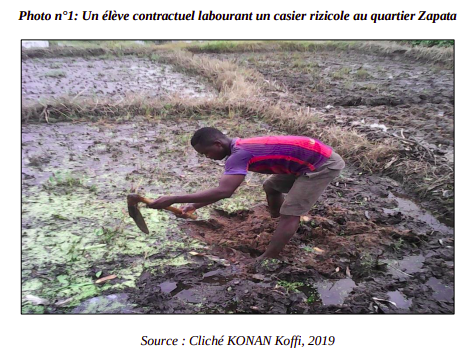 Dans la production rizicole, hormis l’entraide entre les producteurs, le reste des travaux sont proposés de façon journalière et contractuelle aux tâcherons par toutes les catégories de producteurs. Compte tenu de la rupture entre les différentes étapes des travaux rizicoles, les producteurs ne peuvent pas engager des travailleurs en plein temps. Par conséquent, ils sollicitent les élèves (plus de 65% de la main d’œuvre journalière et contractuelle) dans les travaux champêtres. Ils profitent des jours de repos pour aider les producteurs moyennant une somme allant de 1000 FCFA à 1500 FCFA la journée (de 8h à 15h). Avec deux jours de travail par semaine en raison du samedi et dimanche, certains se retrouvent avec 2000 FCFA et 3000 FCFA comme argent de poche durant les jours de l’école.