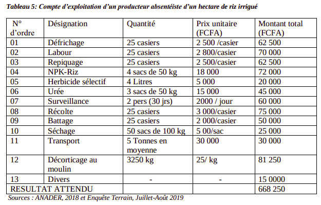 La rentabilité de la production du riz dépend des moyens financiers investis dans le champ. Ainsi pour espérer faire une bonne production il est nécessaire de pratiquer une riziculture intensive. C’est la raison pour laquelle les petits producteurs de riz ont des revenus très faibles par rapport aux producteurs salariés ou absentéistes. Le tableau 5 illustre bien un investissement intensif réalisé par un chef d’exploitation disposant de moyens financiers (producteur absentéiste) qui lui permettent d’investir dans la riziculture pour diversifier ses sources de revenus.