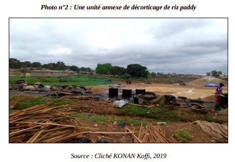 Les unités de traitement de riz ou moulins (56 moulins de la ville) sont les plus grands bénéficiaires de ces activités liées au développement de la filière rizicole dans la ville, car leur implantation et fonctionnement sont essentiellement dus à la riziculture (photo n°2).