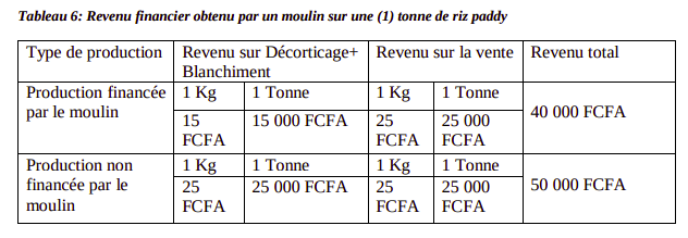 Le tableau 6 indique les revenus qu’obtient en moyenne un moulin après prestation pour le traitement d’une tonne de riz paddy.
