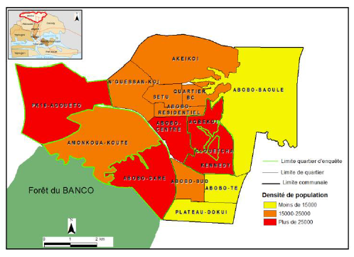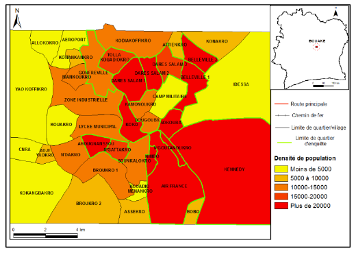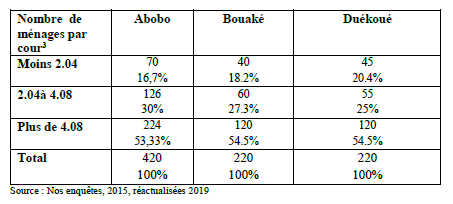 Les communes d’Abobo, de Bouaké et Duékoué subissent une pression en termes de croissance démographie. La commune d’Abobo est passée d’une population de 638237 habitants en 1988, à 1030658 habitants en 2014, soit un taux d’accroissement annuel de 3.2%, celle de Bouaké est passée de 806197 habitants en 1988 à 1010849 habitants en 2014, soit un taux d’accroissement annuel de 1.49%. Celle de Duékoué de 477409 habitants en 1988 à 919392 habitants en 2014, soit un taux d’accroissement annuel 4.39%. Les résultats de nos enquêtes montrent une densité très élevée dans les quartiers d’enquête par rapport aux autres quartiers et la moyenne nationale (cf. Tableau 1).