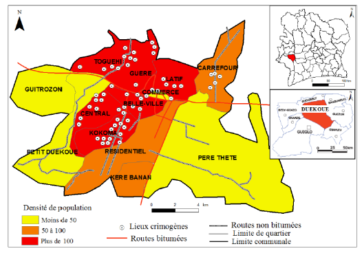 En dehors de ces particularités, les trois communes connaissent une forte croissance démographique et spatiale. Cette croissance inédite est accompagnée d’un développement urbain chaotique accentuant ainsi la fracture sociale, spatiale, les inégalités et la pauvreté Ce développement urbain chaotique déstructure la configuration urbaine en favorisant de nouvelles formes de violence avec de nouveaux acteurs porteurs de cette violence (Pasu, 2018, pp.40) Partant de ces constats, quels sont les défis qu’imposent le phénomène de la violence criminelle pour une politique urbaine de sécurité inclusive et durable ? L’objectif de cette étude est de comprendre les nouvelles configurations spatiales et socio-économique en liens avec les vécus de la violence criminelle dans les communes d’Abobo, de Bouaké et Duékoué. De façon spécifique, il s’agit d’analyser les dynamiques de densité urbaine, du paysage urbain et du processus de réappropriation des espaces par les habitants et les porteurs de violence. En partant du constat d’Henri Lefebvre (2000), selon lequel l’espace est à la fois un produit et un producteur de la vie en société (Lefebvre, les formes des villes produites influent sur le comportement des habitants. La fabrication du milieu physique par les habitants et les acteurs qui le parcourent et le perçoivent de manière sensible en se réappropriant les lieux est au cœur de la dynamique de la violence criminelle (Chelkoff, 2001, p.101). Elle sera couplée de l’analyse de la structure socio-économique de trois communes.