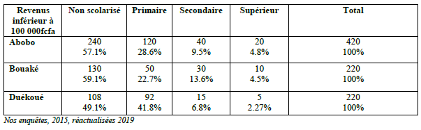 Nos enquêtes à Abobo, Bouaké et Duékoué prenant en compte les seuls actifs (18 ans et plus), dévoilent que 57.1% des ménages non scolarisés ont des revenus mensuels très inférieurs à 100 000fcfa, à Abobo, 59,1% à Bouaké et 49.1% à Duékoué. En effet, dans les trois communes, le faible niveau d’éducation couplé des revenus très bas crée des inégalités, de la pauvreté (Pasu, 2019, pp. 40). Ces résultats sont confirmés lors de nos enquêtes du parcours commentés où l’on observe également un faible niveau de revenus et d’éducation. Chez les populations non scolarisées ayant des revenus très inférieurs à 100 000 fcfa, En effet, le faible niveau d’éducation couplé à des revenus très bas crée des inégalités et de la pauvreté, comme le confirme les chefs des quartiers à Abobo Duékoué et Bouaké « les parents vivent dans des situations très difficiles. Ils n’ont qu’un repas par jour, les enfants doivent se débrouiller pour manger. On peut résumer que oui, c’est dû à la situation économique des parents ».