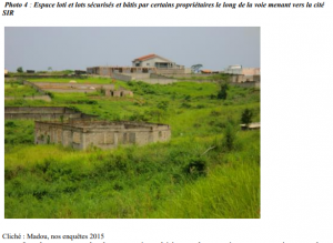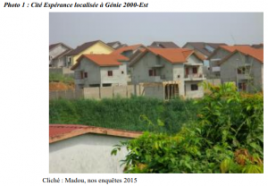 La photo montre des lots occupés et bâtis par des acquéreurs progressivement dans l’extrême-Est de la zone. Nous ne percevons pas la voirie et les réseaux divers. Cela pose des problèmes de circulation et d’assainissement. De plus, certains logements sont bâtis dans des bassins d’orage. Cela expose les populations aux risques d’inondation en cas de très fortes pluies. En outre, nous assistons à un dualisme d’aménagement urbain à Cocody-Est. En effet, dans l’extrême Est, les quartiers qui se créent et sous-équipés pour la plupart, pourraient être qualifiés de quartiers précaires de luxe. Ils contrastent fort bien avec la Riviera zone 1, Riviera 2 et 3 et Cocody centre qui abrite les secteurs de Cocody ancien et Ambassades. Dans ces secteurs, les terrains produits par la SETU avant l’installation des habitants et mis à la disposition des acteurs de production de logements ont bénéficié d’un niveau d’aménagement et d’équipement élevé. La majorité des voies est bitumée, les réseaux divers existent et sont bien visibles. Par contre, dans l’extrême Est de Cocody-Est, les habitants s’installent d’abord et la voirie et les réseaux divers suivent après, ce qui est contraire aux normes d’aménagement. La rupture dans la continuité du tissu urbain est imputable à l’entrée en scène de nouveaux acteurs dans la production foncière et de logements à Cocody-Est suite au désengagement de l’Etat. En effet, des structures informelles sous l’instigation des collectivités villageoises détiennent désormais le monopole de la production foncière, laissant très peu de chance aux structures publiques dont les productions sont isolées pendant cette phase. Il s’agit de la DCGTx, du CTU et de l’Agence de Gestion Foncière (AGEF). Les terrains acquis auprès des structures informelles ont un faible niveau d’équipement en voirie et réseaux divers, surtout, dans l’extrême Est, car ils ne sont pas viabilisés, contrairement à ceux de la première phase. En somme, de notre analyse, il se dégage deux types opposés de logique d’aménagement du tissu urbain lié à la production foncière. La Production foncière informelle donne un espace sous équipé en infrastructures et un espace urbain sans réelle conception et inharmonieux. Tandis que la Production foncière formelle aboutit à un espace équipé en infrastructures et un espace urbain conçu et harmonieux. C’est le modèle souhaité.