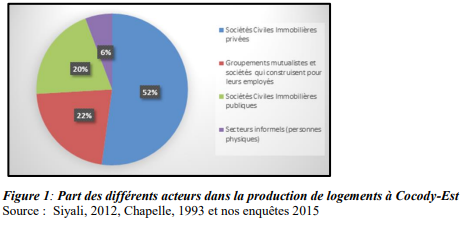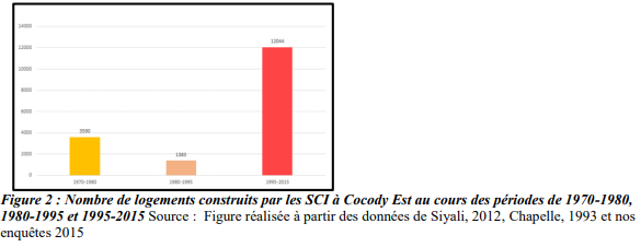 En outre, les logements produits par les SCI privées occupent majoritairement l’espace de Cocody. Pour montrer cela, W.I. Syali (2012, p.236-239) écrit: Entre 1996 et 2002, les SCI privées ont réalisé à Cocody 75 promotions immobilières totalisant 14 386 logements. Les premiers logements modernes produits à Cocody-Est entre 1970 et 1980 sont l’œuvre des SCI publiques. Pour attester cela, B. Blanc et al (1991, Op.Cit, p.18) écrivent: Les SCI ont amorcé le développement de la partie Est de l’axe Est-Ouest à la Riviera et de Deux Plateaux, des quartiers périphériques d’Abidjan. La situation à Dakar n’est pas différente. Pour montrer la part des différents acteurs dans la production immobilière à Dakar, M.Sow (2010, p.222) dit: On estime à 65%, la part des constructions réalisées par les sociétés immobilières privées contre 35% pour les sociétés immobilières publiques.