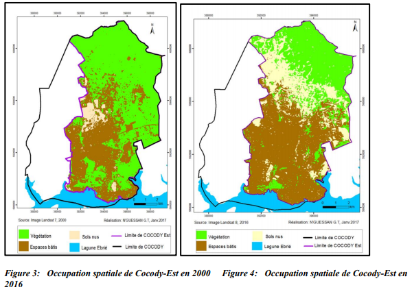 En 2000, les espaces bâtis sont estimés à 2944,9 hectares et les sols nus à 336,9 hectares. Ils représentent de façon respective 35,80% et 4,10% de la superficie. L’espace urbanisé est donc évalué à 3281,8 hectares, soit 39,90% de la superficie totale de Cocody-Est évaluée à 8224,3 hectares. Ces différentes superficies ont évolué entre 2000 et 2016. Les espaces bâtis en 2016 sont passés à 3904,5 hectares et les sols nus à 1724,2 hectares, soit respectivement 47,7% et 21% de la superficie totale. L’espace urbanisé qui est de 5628,7 hectares en 2016, soit 68,44% de la superficie de Cocody-Est, s’est accru de 2346,9 hectares en 16 ans et le taux de croissance est de 28,53%. En outre, entre 2000 et 2016, les espaces bâtis et les terrains urbains ont connu respectivement une augmentation annuelle de 60 hectares et 86,7 hectares contre 24,85 hectares entre 1987 et 2000 (l’espace bâti en 1987 étant estimé à 2621,80 hectares). En revanche, entre 1987 et 2000, les terrains urbains ont plutôt régressé, passant de 1156,4 à 336,9 hectares, soit une réduction de 819,5 hectares en 13 ans. L’évolution des espaces bâtis se fait au détriment des exploitations agricoles qui ont quasiment disparus et du couvert végétal qui est passé de 4942,5 hectares en 2000 à 2586,35 hectares en 2016, soit une perte de 2356,15 hectares en 16 ans. La perte annuelle est de 147,25 hectares. Cette dynamique spatiale est liée surtout, à la croissance démographique d’Abidjan et de Cocody et à la satisfaction des besoins de cette population en logements dont le déficit annuel est estimé à 20 000 (Ministère de la construction, nos enquêtes 2015). En effet, de 951 216 habitants en 1975, la population d’Abidjan est passée à 4 653 592 habitants en 2014 (INS, RGPH 1998 et 2014), soit une hausse de 3 702 376 habitants en 39 ans. Quant à celle de Cocody, elle est passée de 38 424 à 447 055 habitants, respectivement en 1975 et 2014 (BNETD, 1996, p.7 et INS, RGPH, 2014), soit une augmentation de 408 631 habitants en 39 ans.