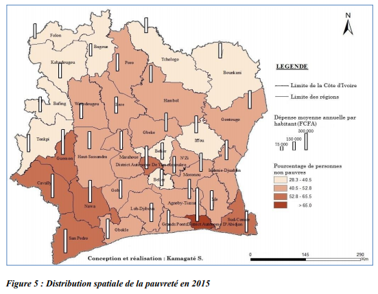 La distribution spatiale de la pauvreté en Côte d’Ivoire fait ressortir des disparités entre les différentes portions du territoire national (figure 5). L’enquête sur le niveau de vie des ménages réalisée en 2015 considère comme pauvres, les personnes vivant avec moins de 737 Francs CFA (1.12 euro) par jour. Ainsi, plus de la moitié de la population ivoirienne est considérée comme pauvre. Cependant, il y a des déséquilibres spatiaux à l’avantage de la moitié sud du pays.
