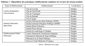 L’offre de soins sanitaires reste marquée par une forte disparité dans la répartition des centres de santé et des ressources humaines au profit des régions du Sud du pays, notamment d’Abidjan. En effet, le système de santé ivoirien, de type pyramidal à trois niveaux fait la part belle à la capitale économique. Le niveau tertiaire comprenant 14 établissements sanitaires de recours pour la deuxième référence se concentrent à Abidjan avec 11 unités (tableau 2).