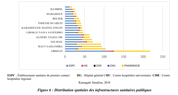 Le niveau secondaire constitué des établissements sanitaires de recours (Hôpitaux Généraux, Centres Hospitaliers Spécialisés) pour la première référence sont majoritairement localisés à Abidjan. Quant aux établissements de niveau primaire représentés par les Etablissements Sanitaires de premiers Contacts (ESPC), Abidjan vient encore en tête des infrastructures (fig.6).