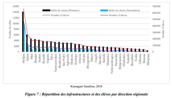 Au cours de l’année scolaire 2016-2017, sur 90.970 salles de classes du primaire et 30.978 du secondaire à l’échelle nationale, Abidjan regorgeait respectivement 15,48% (14.088) et 32% (9.884) des salles. Cette tendance est aussi de mise dans la répartition des effectifs des apprenants où la ville abrite 666.088 écoliers et 487.643 collégiens et lycéens. La seconde ville en terme de score est Daloa qui enregistre environ 5.979 salles de classe au primaire, 275.127 salles de classe au secondaire, 275127 écoliers et 123111 élèves du secondaire. Dans le cycle supérieur, sur 45 Etablissements d’enseignement supérieur privé de type universitaire, 38 sont localisés à Abidjan qui compte par ailleurs 03 universités publiques sur les 06 que compte le pays.