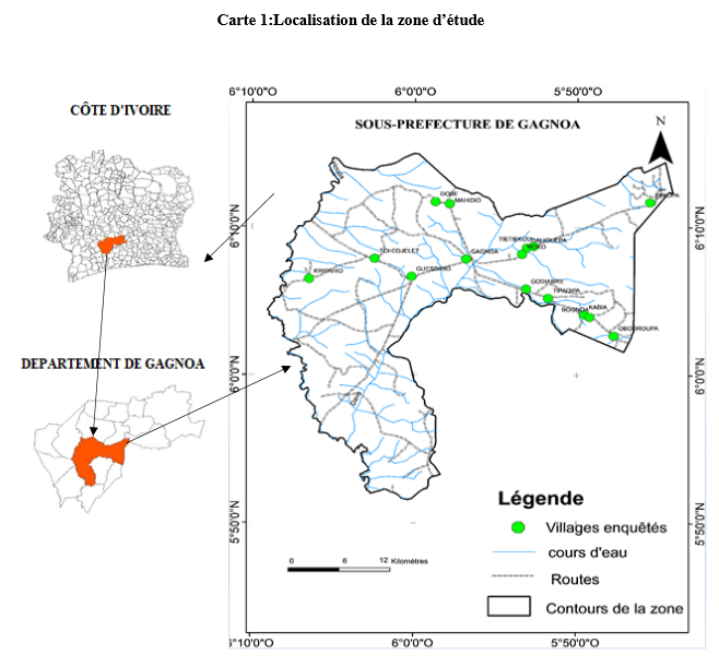 Gagnoa est le chef-lieu de la région du Gôh. Elle est située entre les latitudes 6°08’00 et 5°56’00 Nord et les longitudes 5°10 et 6°10 Ouest. Avec une superficie de 2119 km², cette zone abrite en son sein 602 097 habitants, soit 73 habitants au km² et est composé de 10 sous-préfectures dont la sous-préfecture de Gagnoa. C’est une population composite avec comme autochtones, les Bété. A ceux-ci s’ajoutent les Akan, les Malinkés, et les étrangers venus des pays voisins tels que le Burkina Faso, le Ghana, le Mali (BETPA, 1985). En effet, la sous-préfecture de Gagnoa regroupe 52 villages. Mais, seulement 15 d’entre eux ont fait l’objet d’enquêtes (figure 1). L’agriculture est la principale activité génératrice de revenus développées par les populations locales (Doumbia 2009). Le climat du Centre-Ouest de la Côte d’Ivoire, région où se situe notre zone d’étude est de type très humide (Coulibaly, 2016). Gagnoa est arrosée par la rivière Davo, affluent du fleuve Sassandra, sur sa rive droite. Sa végétation originelle est la forêt dense humide semi-décidue (Guillaumet, Adjanohoun, 1971). En état stable, ces éléments du milieu physique représentent des conditions favorables à la culture du riz pluvial qui demeure exigeant en eau (N’Da, 2016).
