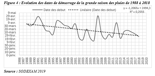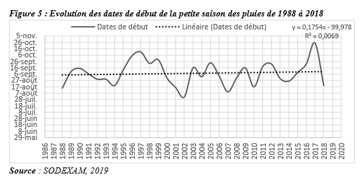 Les figures 4 et 5 présentent l’évolution interannuelle des dates de démarrage des saisons pluvieuses sur la période 1988-2018. Ces résultats proviennent de l’analyse des données pluviométriques journalières de 1988 à 2018.