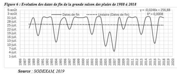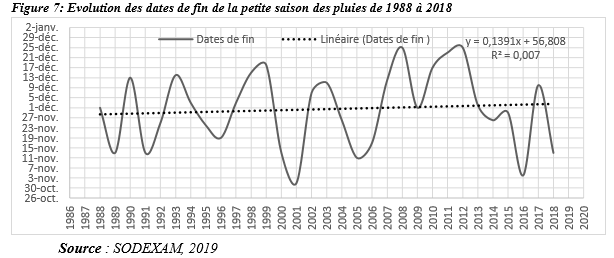 L’analyse de la figure 6 indique, au niveau de la fin de la grande saison des pluies, une tendance générale précoce avec notamment d’importantes variations interannuelles. La date moyenne de fin de la grande saison humide est le 25 Juillet. Concernant l’analyse de la figure 7, la petite saison humide, connait de fortes variations avec une tendance générale tardive. La date moyenne de fin de la petite saison des pluies est le 30 novembre. Les plus extrêmes fins de cette saison humide coïncident avec les années 2008, 2011, et 2017 où elle prend fin respectivement les 22, 23, et 25 décembre. En outre, les dates de fin des saisons humides varient d’une année à l’autre dans notre zone d’étude. Elles sont précoces pour la grande saison et tardive pour la petite saison de 1988 à 2018.