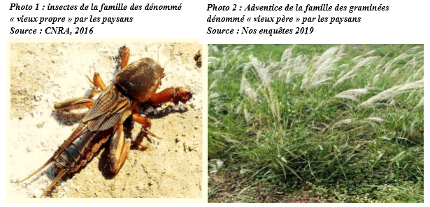 Les changements récurrents des paramètres climatiques induisent des effets significatifs tant sur la végétation que sur les ressources animales (Dagnogo, 2019). Ces effets sont ressentis de diverses manières selon les paysans. Ce sont entre autres l’apparition d’espèces animales et végétales impactant l’activité agricole. Ainsi 75% des paysans note l’apparition de nouvelles espèces végétales et animales (insectes) qui ravagent leurs parcelles agricoles et réduisent leur production. En effet, ces espèces d’herbes vieux-père (appellation locale ; photo 2) et insectes le vieux propre (appellation locale ; photo 1) dérangent dans leurs pratiques agricoles.