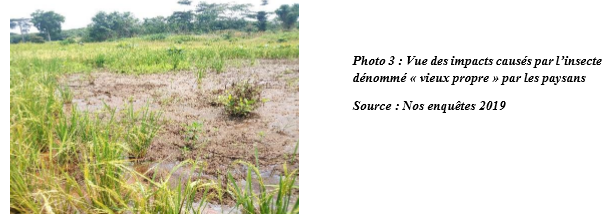 La photo 3 montre les ravages occasionnés par l’insecte vieux propres. Les paysans ajoutent que ces insectes s’attaquent aux racines des plants de riz et vont jusqu’à ramener une parcelle sans plants de riz.
