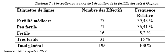 La variabilité des paramètres climatiques de ces dernières décennies génère des impacts non négligeables sur les sols des parcelles agricoles. Un volet de notre questionnaire a été consacré à la perception paysanne de l’évolution de la fertilité des sols. Les résultats de cette perception sont consignés dans le tableau 2.