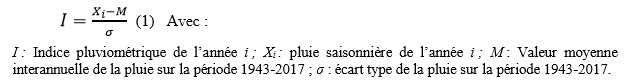 Les données climatiques utilisées sont les paramètres déterminants pour l’agriculture pluviale dont les hauteurs de pluies journalières, les températures moyennes mensuelles, l’évapotranspiration potentielle (ETP) décadaire (Boko, 1988 ; Ogouwalé, 2006). Ces données couvrent la période 1988-2018. Elles proviennent de la station synoptique de la SODEXAM de Gagnoa. Avant la phase de traitement de ces données, elles ont été contrôlées à l’aide de la méthode du double cumul pour vérifier leur homogénéité et s’assurer de leur qualité (N’Da, 2016, Dagnogo, 2019). Ces données ont permis de calculer les indices pluviométriques annuels (Lamb, 1982 ; Nicholson et al., 1988 ; Noufé et al., 2011 ; N’Da, 2016, Dagnogo, 2019) à partir de la formule suivante :