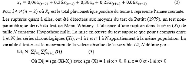 Une observation de meilleures fluctuations interannuelles s’obtient par l’emploi du filtre non récursif passe-bas de Hanning d’ordre 2 (moyennes mobiles pondérées centrées réduites) recommandé par Tyson et al. (1975), Assani (1999) et N’Da (2016). Dans ce cas, les totaux pluviométriques annuels sont pondérés en utilisant l’équation suivante :