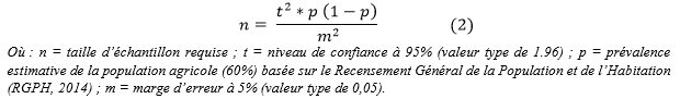 1.3.Données d’enquêtes La taille de l’échantillon est de 195 personnes. Elle est obtenue en utilisant la formule non probabiliste suivante (Diomandé et al., 2013 ; Coulibaly et al., 2016) :